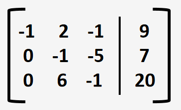 这样我们就把二三行的x消去了,接下来我们继续消去第三行的y,我们可以在第三行的基础上加上(第二行×6),结果如下
