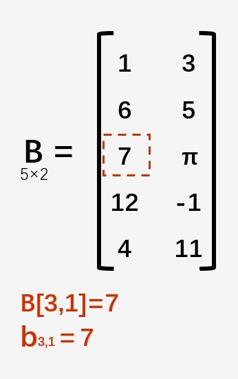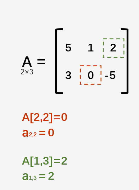 A[1,3]即表示A矩阵的第一行第三列的数字,即2,而 A[1,3] 与 a₁,₃ 是等价的。