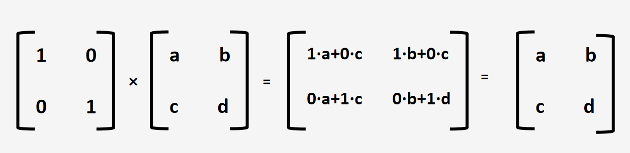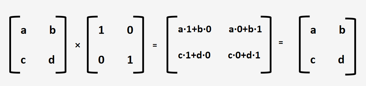 而单位矩阵有一个特性,即任何矩阵(方阵)乘以单位矩阵的结果都是其本身,即A·I=A ,反过来亦是如此:I·A=A,我们可以用以下例子求证: